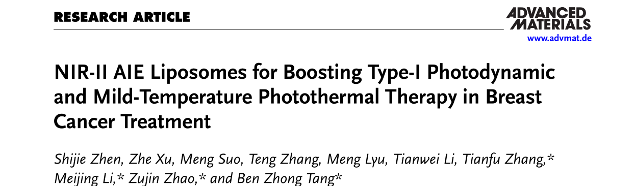 近日,SeedHub甄士杰老师/李美静博士联合广州医科大学张天富副教授、华南理工大学赵祖金教授和香港中文大学(深圳)唐本忠院士在顶级期刊Advanced Materials上发表题为《NIR-II AIE Liposomes for Boosting Type-I Photodynamic and Mild-Temperature Photothermal Therapy in Breast Cancer Treatment》(10.1002/adma.202411133)的研究论文。论文第一作者是SeedHub甄士杰博士、徐哲硕士及广州医科大学索萌博士,SeedHub