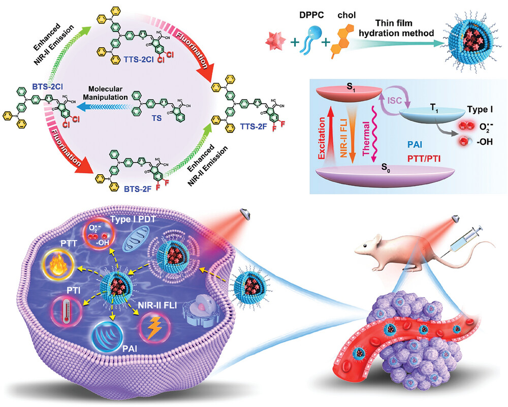 图1 NIR-II AIE光敏剂的制备、脂质体的构筑及小鼠乳腺癌多模态光诊疗示意图