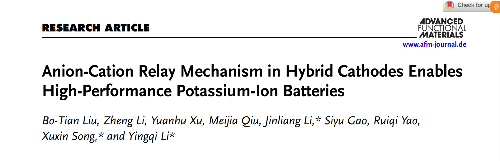 刘博天团队联合暨南大学黎晋良、东北师范大学李英奇团队在国际顶级期刊Advanced Functional Materials上发表题为“Anion-Cation Relay Mechanism in Hybrid Cathodes Enables High-Performance Potassium-Ion Batteries” (doi.org/10.1002/adfm.202509849) 的研究论文。论文第一作者是SeedHub刘博天副研究员和研究生李政,SeedHub