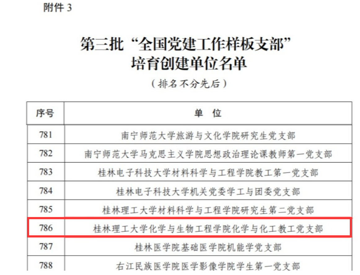 化学与化工教工党支部入选第三批“全国党建工作样板支部”培育创建单位。
