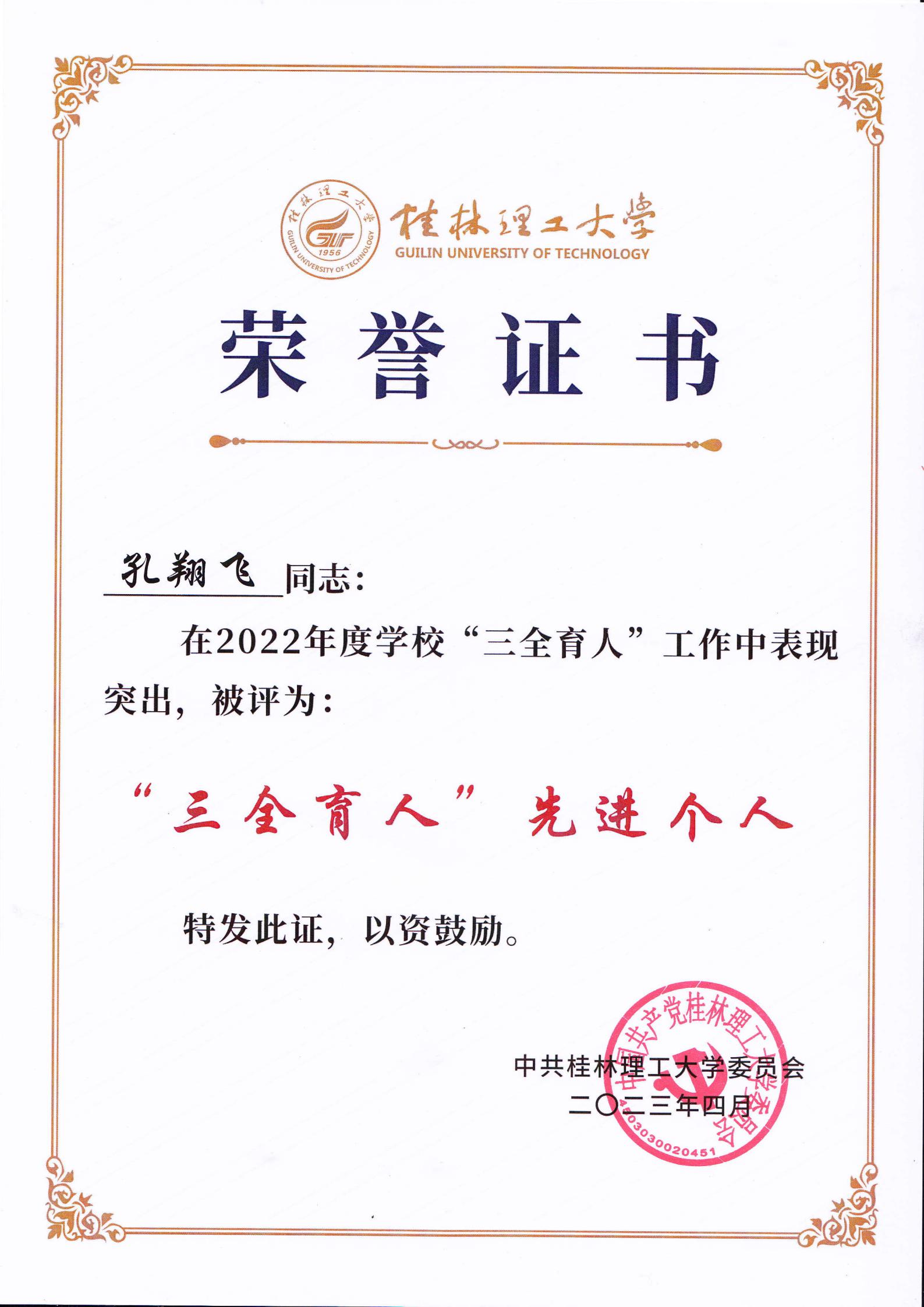 “三全育人”先进个人荣誉证书